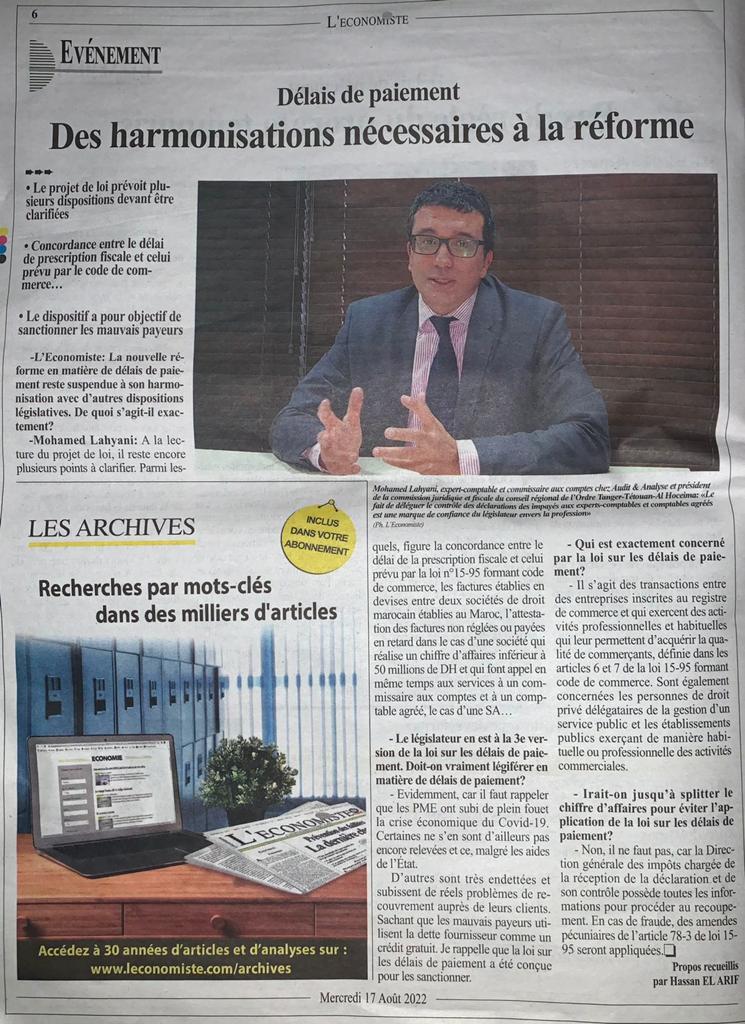 | 17/08/2022 | L'ECONOMISTE : DÉLAIS DE PAIEMENT |
